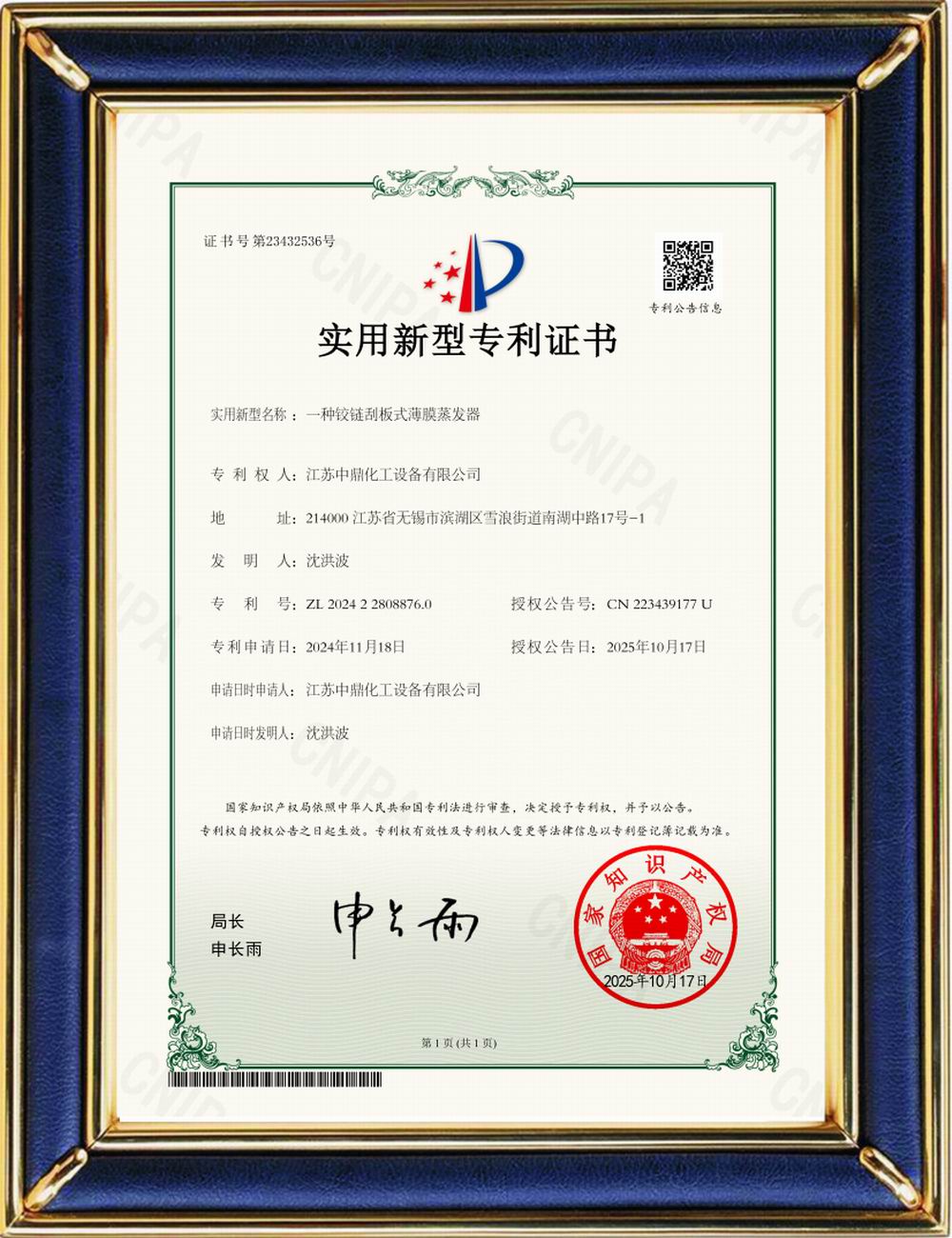 铰链刮板式薄膜蒸发器(专利证书)