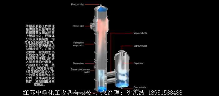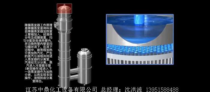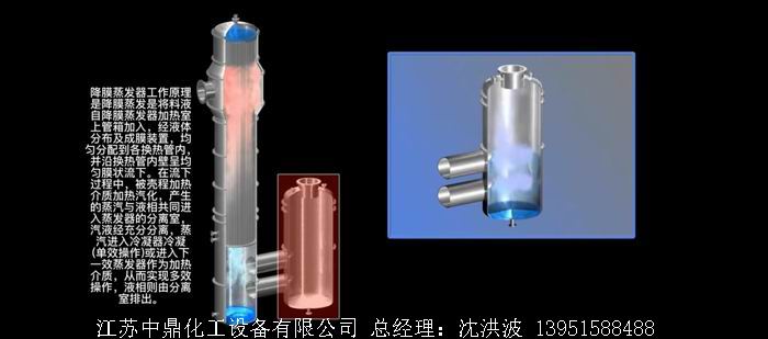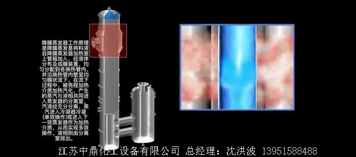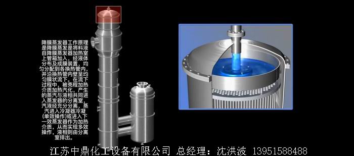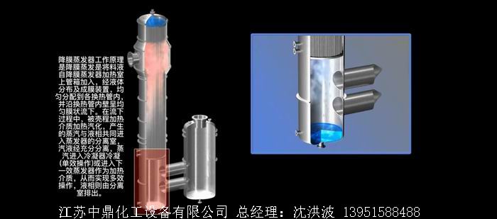 物料由设备顶部进入,经降膜头+液体分布器均匀分配至每根换热管内壁,在重力、真空与二次蒸汽牵引下形成连续均匀液膜(厚度0.1–2mm)自上而下流动;壳程通入加热蒸汽/导热油,热量通过管壁传递给液膜,物料快速蒸发/部分汽化,汽液混合物在底部或配套分离器分离;作为再沸器使用时,直接为精馏塔提供上升蒸汽,无需额外大容积分离。