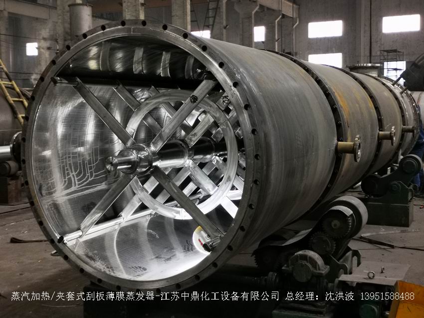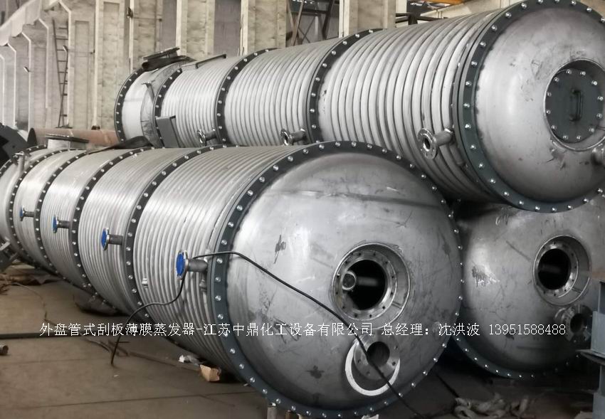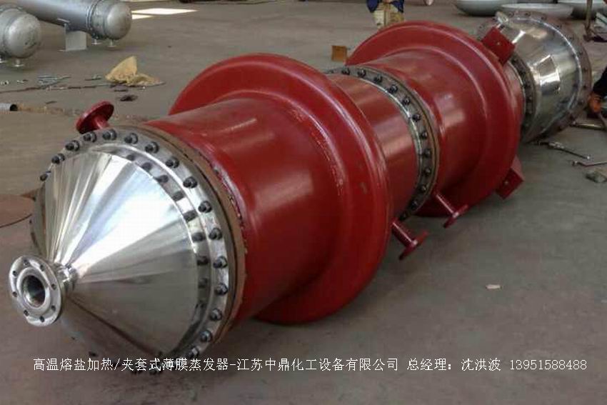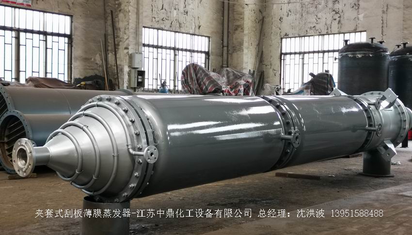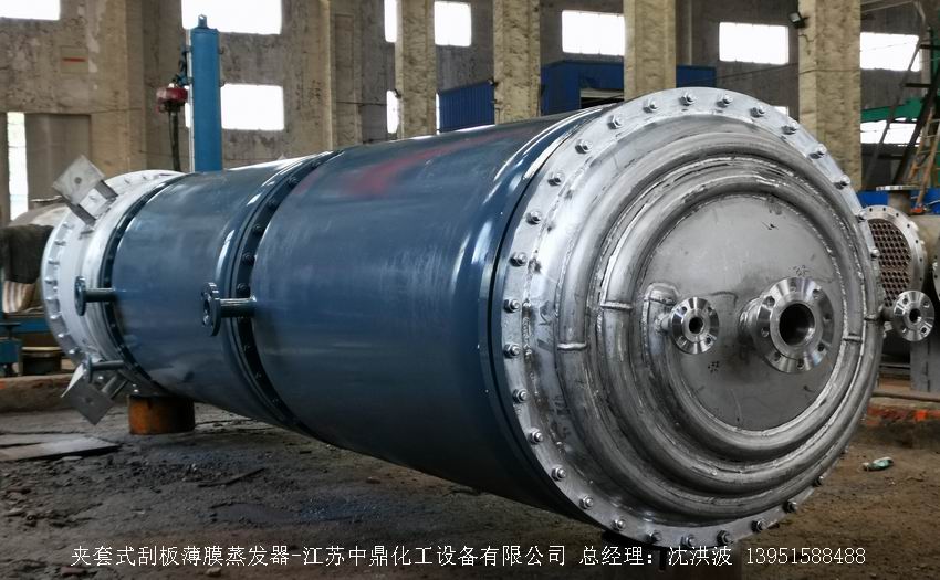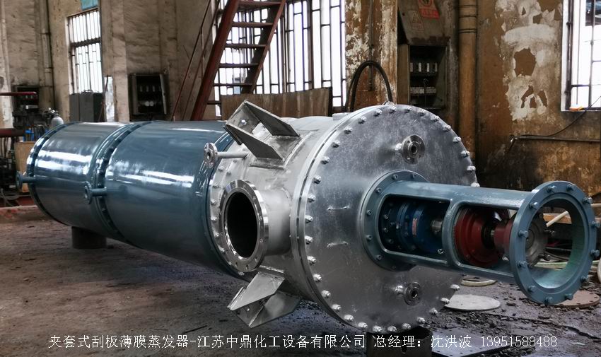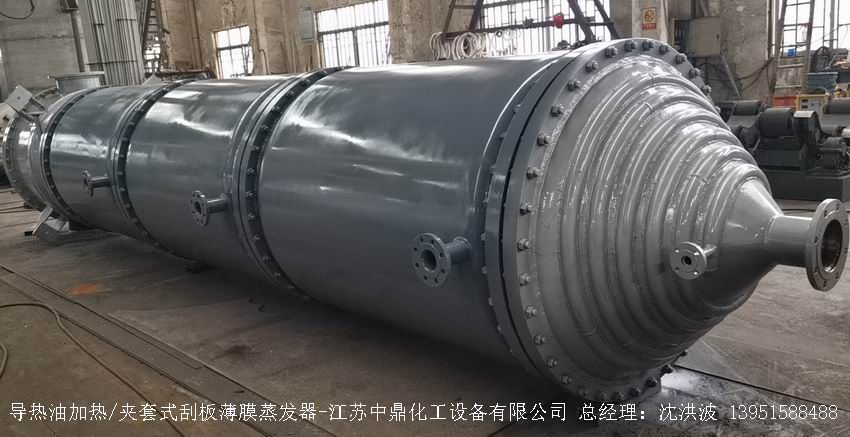 江苏中鼎化工设备有限公司--离心式刮板薄膜蒸发器主要由加热外盘半管式夹套(半管夹套内走蒸汽,导热油,熔盐或者热水等循环给蒸发器外壁加温,通过热传导,把蒸发器内壁形成的物料薄膜中的水份蒸发减少,提高物料的浓度百分比。一般设计压力为0.3mpa~2.5mpa左右,