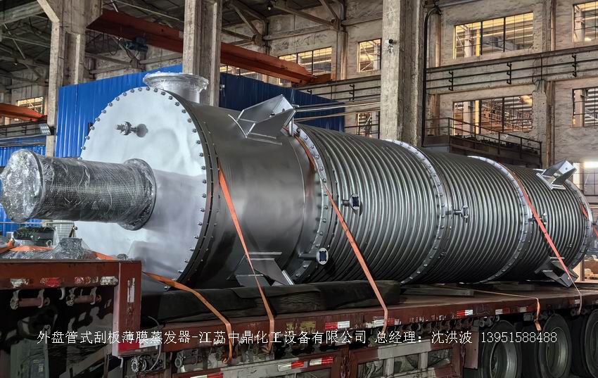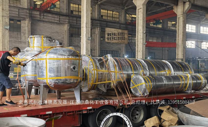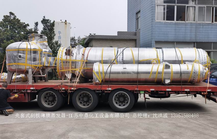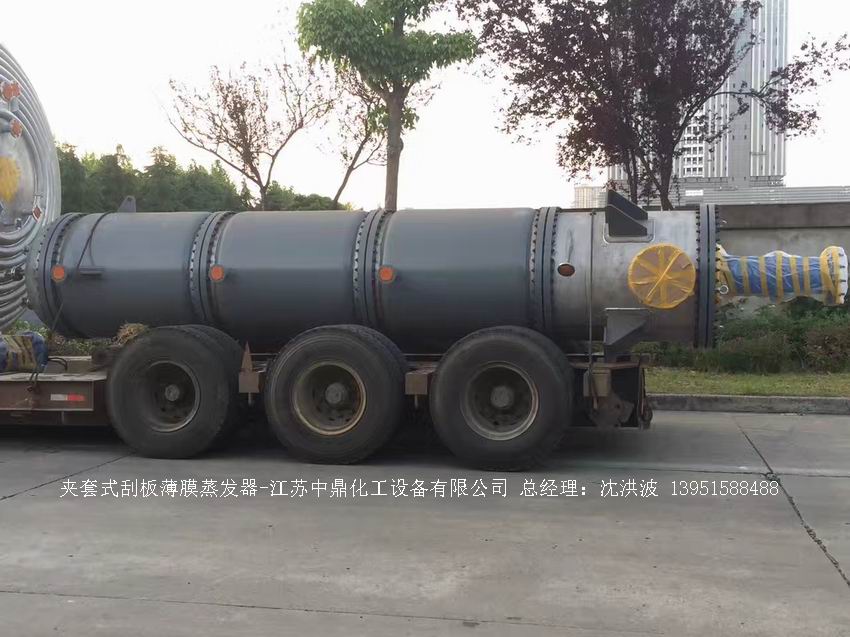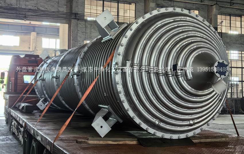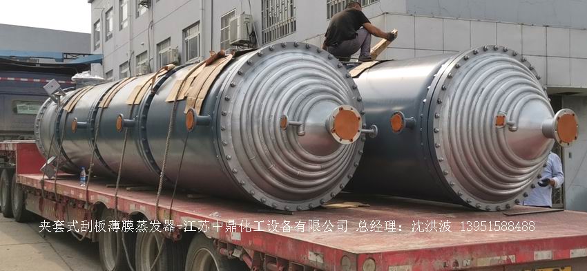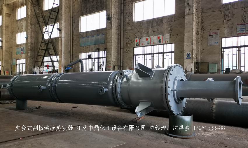 江苏中鼎化工设备有限公司--离心式刮板薄膜蒸发器主要由加热外盘半管式夹套(半管夹套内走蒸汽,导热油,熔盐或者热水等循环给蒸发器外壁加温,通过热传导,把蒸发器内壁形成的物料薄膜中的水份蒸发减少,提高物料的浓度百分比。一般设计压力为0.3mpa~2.5mpa左右,