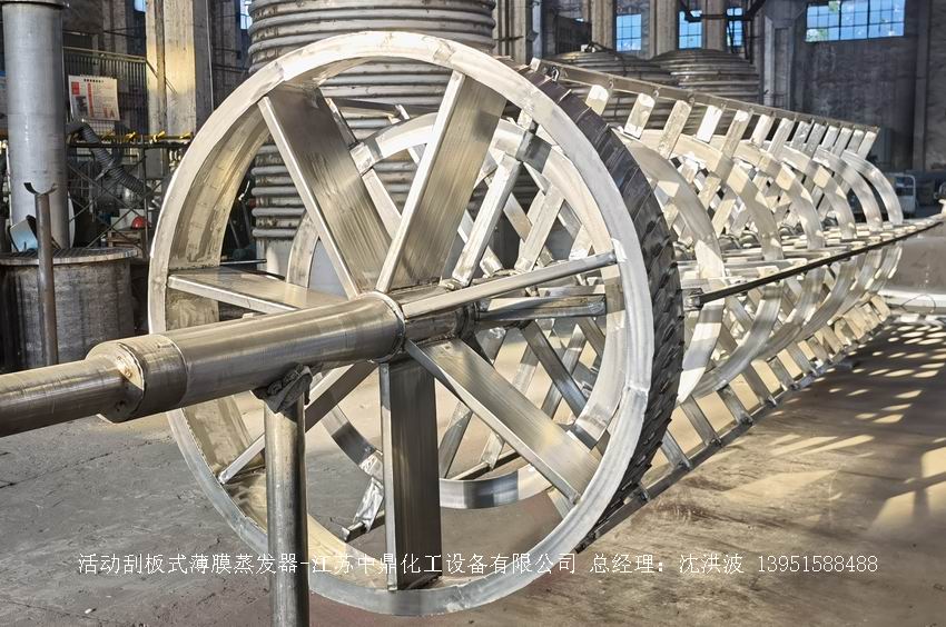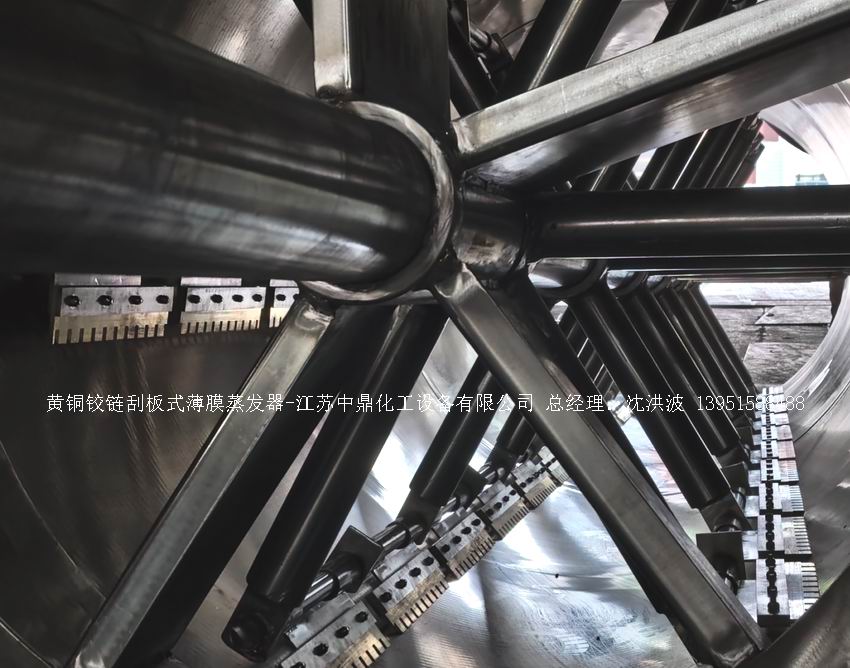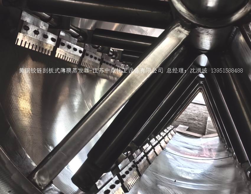 夹套内或者外盘半管内通加热的热源,刮板装在可旋转的轴上,刮板和加热夹套内壁保持很小间隙,通常为0.5~1.5 mm。在旋转时通过离心力,使刮板与内壁紧密接触。把物料从壁上刮下。料液经预热后由蒸发器上部进料口沿切线方向喷进,通过液体分布器分散盘把液体均匀分布到蒸发器筒体表面,在重力和旋转刮板的作用下,均匀分布在蒸发器内壁形成下旋薄膜,并在下降过程中不断被蒸发浓缩,完成液由底部排出,二次蒸汽向上从顶部仓逸出(一般通过真空泵抽出)二次蒸汽再通过汽液分离器、冷凝器处理。在某些场合下,这种蒸发器可将溶液蒸干,在底部直接得到固体产品。这类蒸发器的缺点是结构复杂制造\安装和维修工作量大。