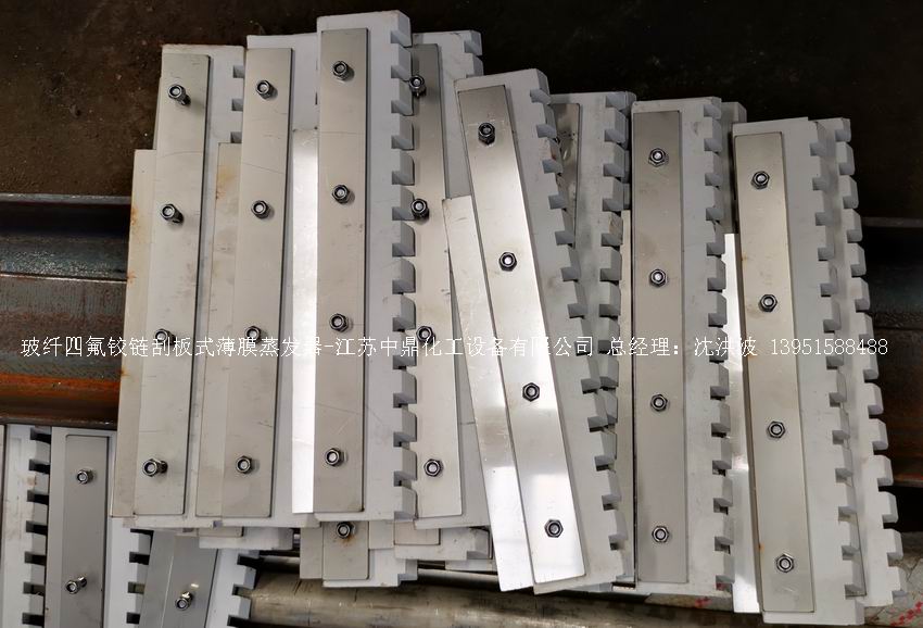 滑动刮板:最基本常见,安装在转子刮板导槽内,受离心力沿径向甩向蒸发筒体内壁,随转子圆周运动。使物料呈膜状湍流,提高传热系数,抑制过热等现象。低于180℃用玻纤聚四氟材质,高于180℃~250℃用碳纤维四氟材质,端面有导液槽。