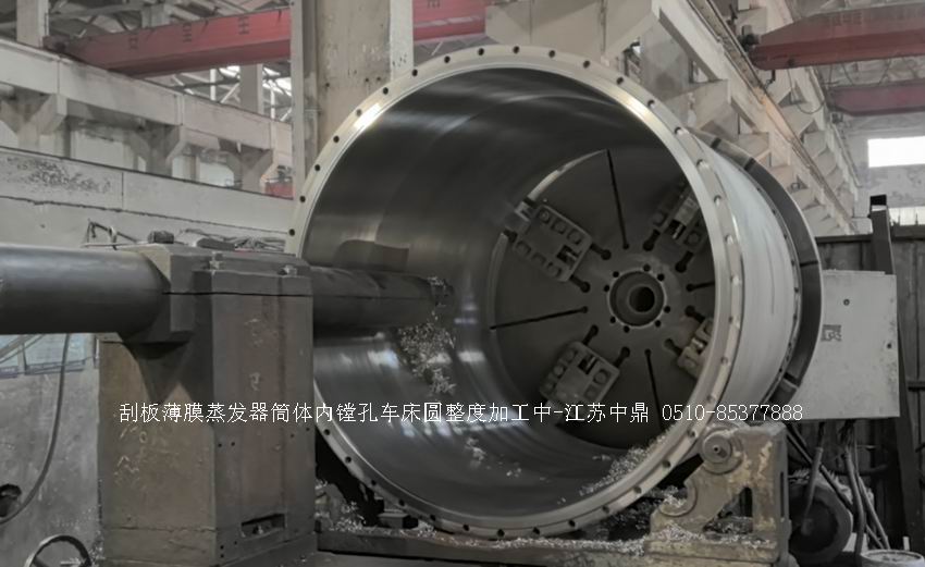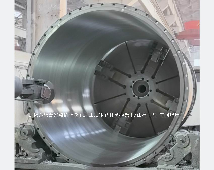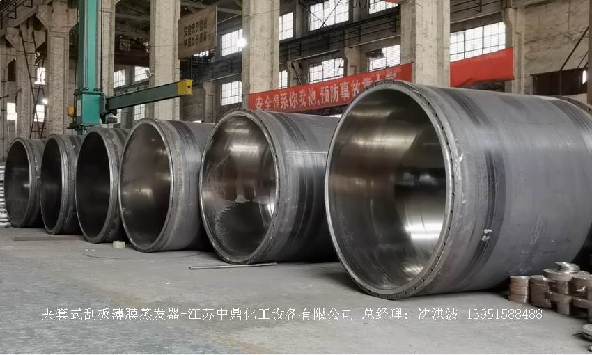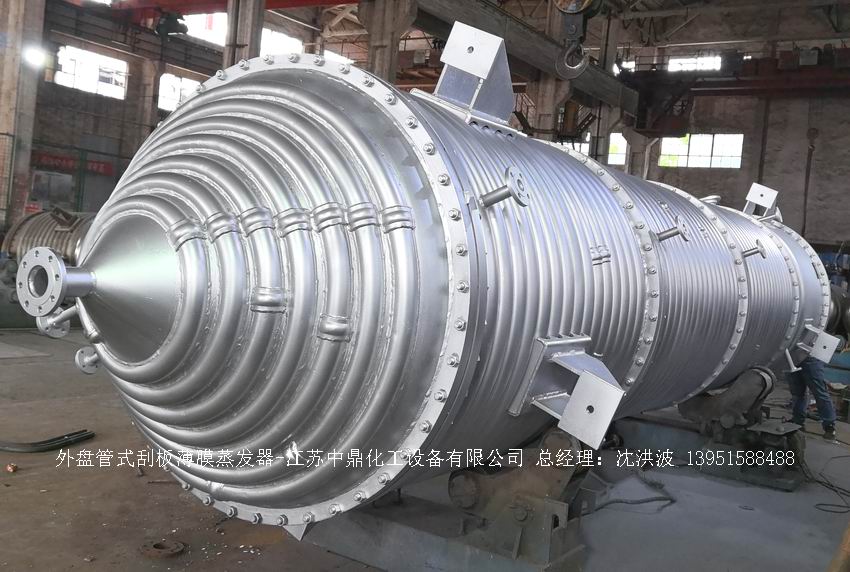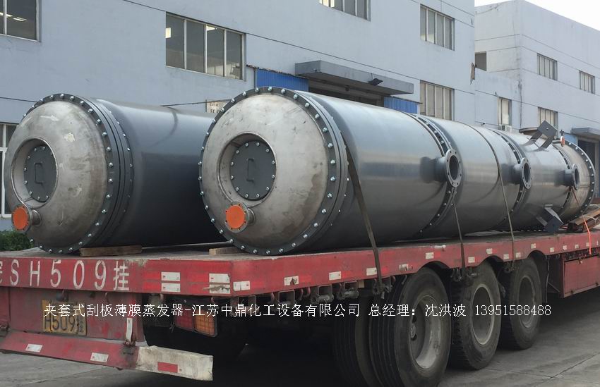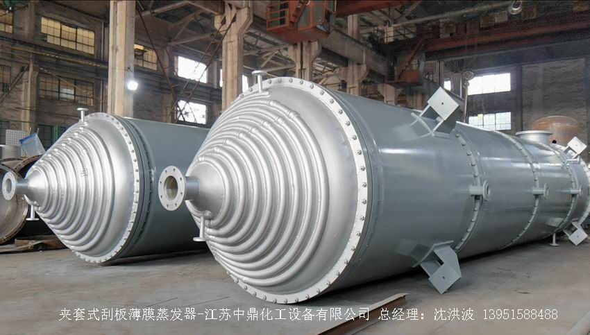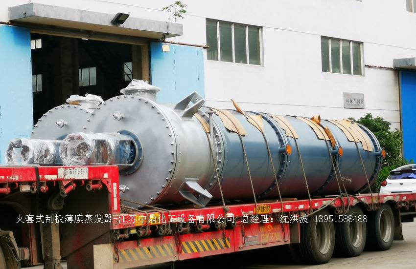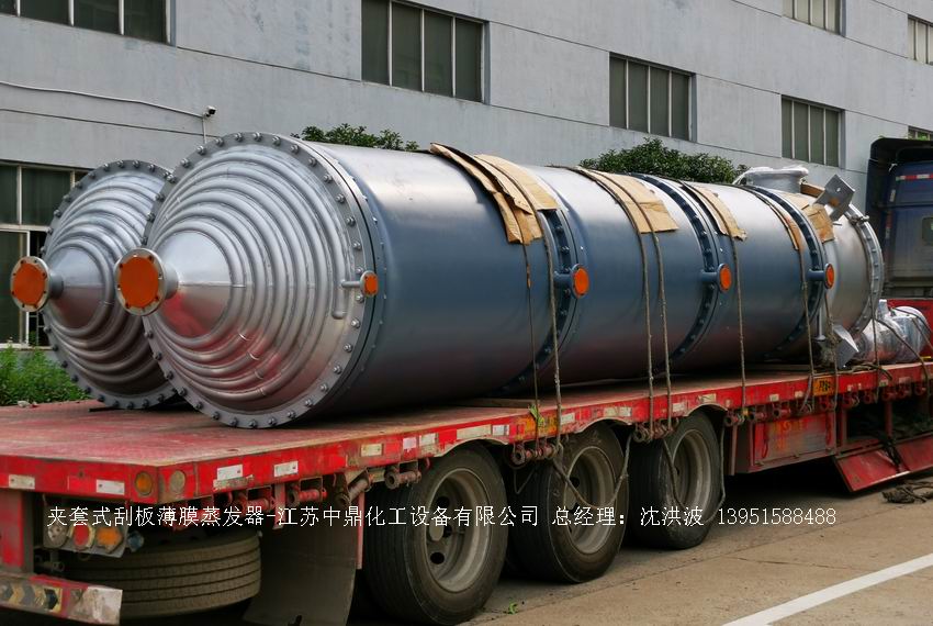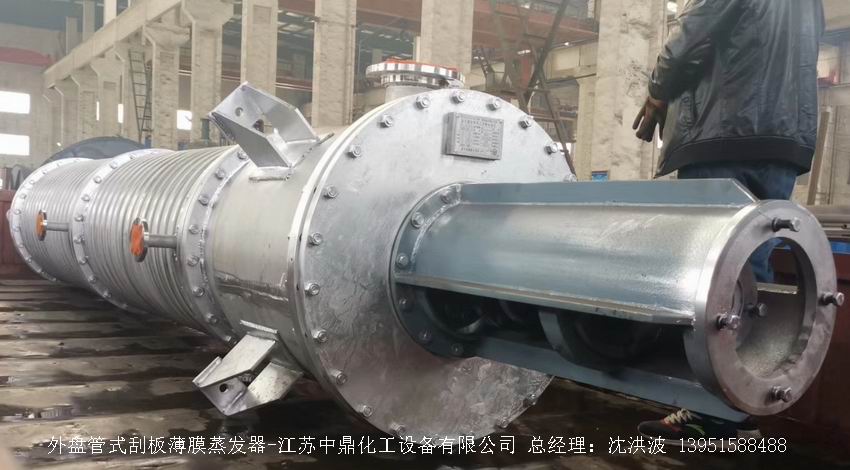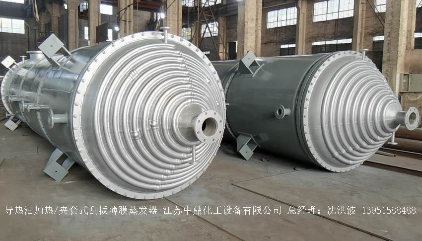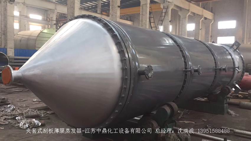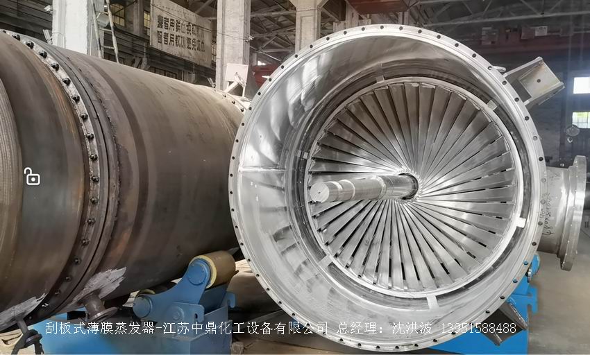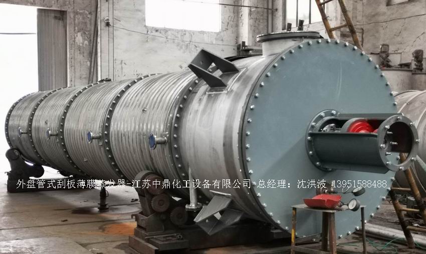 江苏中鼎化工设备有限公司--离心式刮板薄膜蒸发器主要由加热外盘半管式夹套(半管夹套内走蒸汽,导热油,熔盐或者热水等循环给蒸发器外壁加温,通过热传导,把蒸发器内壁形成的物料薄膜中的水份蒸发减少,提高物料的浓度百分比。一般设计压力为0.3mpa~2.5mpa左右,如果是蒸汽温度一般在180°以下,导热油温度一般在280°以下,熔盐温度一般在380°以下。刮板也称刮刀(刮板分为:玻纤四氟刮板、碳纤维四氟刮板、石墨四氟刮板、黄铜刮板、合金钢等)和传动装置:电机(普通变频电机、防爆变频电机、高速变频电机),减速机(摆线针轮减速机、齿轮减速机),机架,轴封系统(单端面机械密封、双端面机械密封、磁力密封等,如果抽真空必须选用双端面机械密封或者磁力密封),转动轴、汽液分离装置、液体分布器、蒸发器转子支架、轨道刮板槽、底部轴套等部件组成。外盘半管内或者夹套内通加热的热源,刮板装在可旋转的轴上,刮板和加热夹套内壁保持很小间隙,通常为0.5~1.5 mm。在旋转时通过离心力,使刮板与内壁紧密接触。把物料从壁上刮下。料液经预热后由蒸发器上部进料口沿切线方向喷进,通过液体分布器分散盘把液体均匀分布到蒸发器筒体表面,在重力和旋转刮板的作用下,均匀分布在蒸发器内壁形成下旋薄膜,并在下降过程中不断被蒸发浓缩,完成液由底部排出,二次蒸汽向上从顶部仓逸出(一般通过真空泵抽出)二次蒸汽再通过汽液分离器、冷凝器处理。在某些场合下,这种蒸发器可将溶液蒸干,在底部直接得到固体产品。这类蒸发器的缺点是结构复杂制造\安装和维修工作量大。
